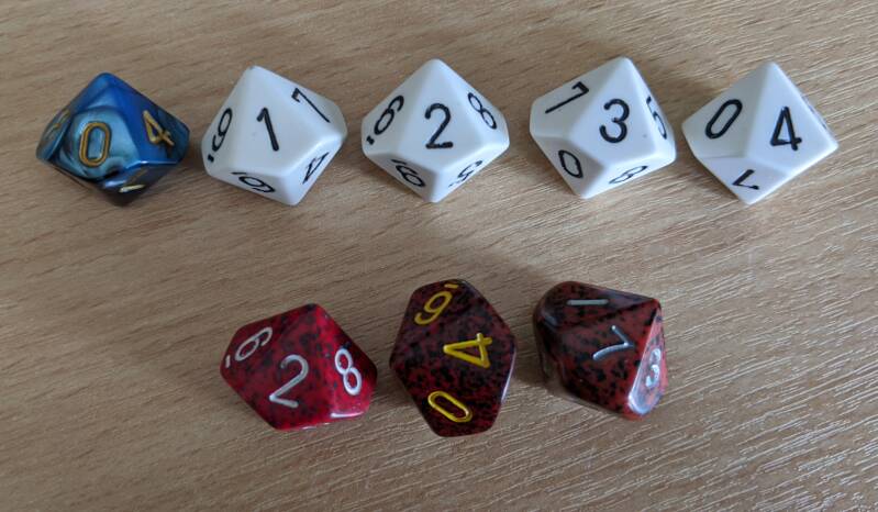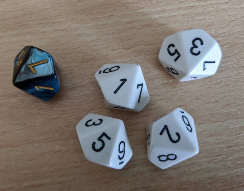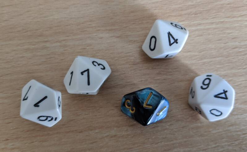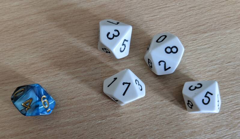 The dealer's crib in cribbage is always 4 cards, hence your crib is always 4 dice, using 10-sided dice (d10s) to represent the cards. It's best to find 4 dice of the same colour to represent your crib. In addition, there is a fifth dice, known as your Virtue Dice (your main attributes/ability scores in the game are called virtues). Whilst the virtue dice functions on its own, merely adding the value rolled to the result, the crib dice are used to score (or "peg") extra points and additional effects (which we will talk about later).